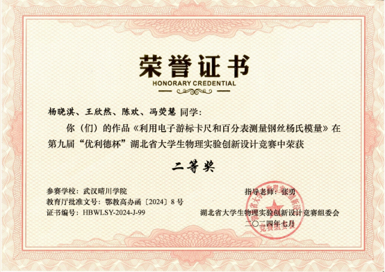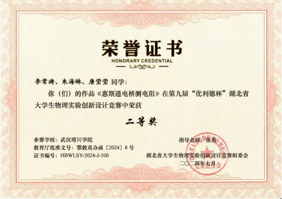 2024年7月13日-7月15日,第九届“优利德杯”湖北省大学生物理实验创新设计竞赛决赛在华中师范大学举行。经过两天的激烈角逐,武汉晴川学院选派的3支参赛队伍,与来自华中科技大学、武汉大学、华中师范大学等全省47所高校的613支代表队同台竞技,荣获二等奖2项,三等奖1项的佳绩。