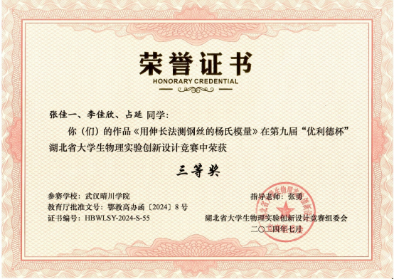 据悉,湖北省大学生物理实验创新设计竞赛由湖北省教育厅、湖北省物理学会、湖北省物理实验教学示范中心联席会和湖北省高等学校实验物理教学研究会联合主办,旨在激发大学生对大学物理和物理实验课程的学习兴趣和学习潜能,在实践中培养学生的创新精神和实践能力,在竞争中提升学生的团队协作意识和综合素质,是省内物理实验领域规模最大、含金量最高、影响力最广的本科学生竞赛。