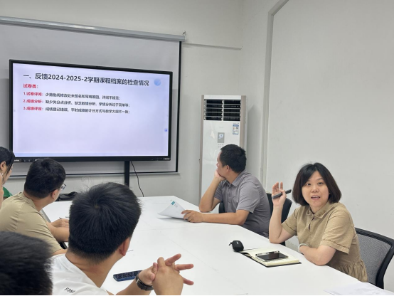 会上,俞霜副主任首先传达了学校关于2024-2025-2学期课程档案集中检查的反馈意见,并对课部课程档案检查情况进行了详细说明。分试卷类和非试卷类分别总结了存在的问题,如试卷批阅的规范性、成绩评定的一致性、成绩分析的针对性,以及非试卷类材料的完整性、整理归档的合理性等方面的不足。针对这些问题,要求相关教师在前期集中整改的基础上,再认真对照检查结果积极完善,确保课程档案的质量符合本科教学合格评估的要求。