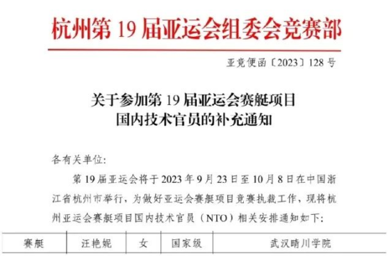 10月8日,杭州第19届亚运会正式闭幕,武汉晴川学院体育教研室赛艇俱乐部教练汪艳妮老师,受本届亚运会组委会竞赛部选派,担任亚运会赛艇项目竞赛技术官员,圆满完成了本次大赛的执裁工作。