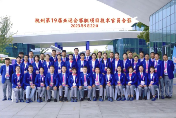 我校教师汪艳妮(第二排左三)在第十九届亚运会中担任赛艇项目竞赛技术官员