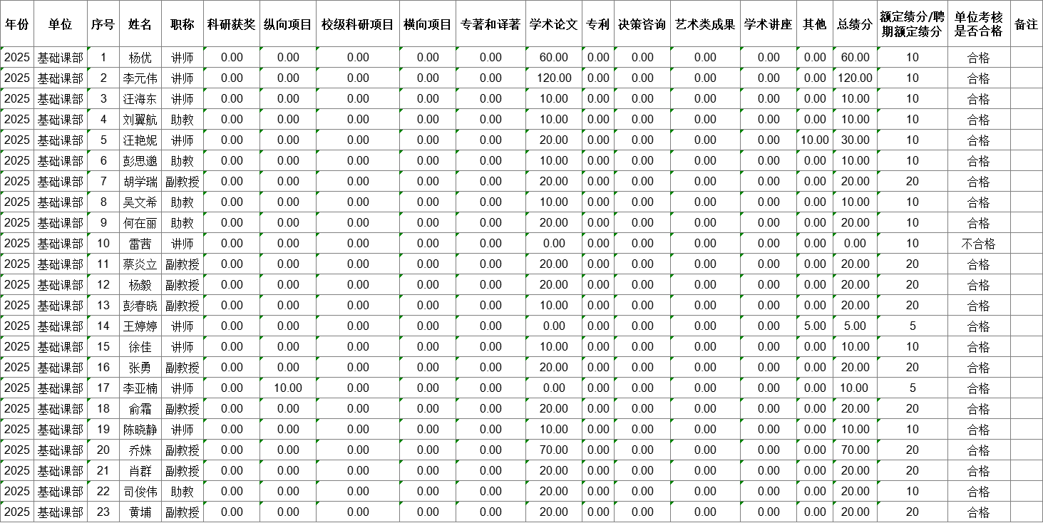 根据《武汉晴川学院教师科研工作考核办法(试行)》《伟德国际唯一官网入口教师科研工作考核办法(试行)》文件精神,参照《关于开展武汉晴川学院2025年教师科研成果统计、科研工作考核与成果奖励工作的通知》要求,伟德国际唯一官网入口2025年度科研考核采取线上自主申报与学术委员会集中审议相结合的形式进行,现将年度科研考核结果予以公示: