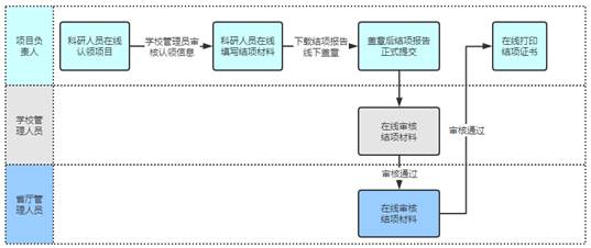 负责人登录云平台填写结项信息-->下载系统生成的结题报告书并打印一份签名-->交科研处审核盖章->科研处将盖章页扫描件发给项目负责人->项目负责人将结题报告书中盖章页替换后重新上传系统->科研处审核后下载系统生成的专家意见表->项目负责人填写专家意见表后交科研处->科研处上传系统->省厅审核,相关操作要求请参阅附件。